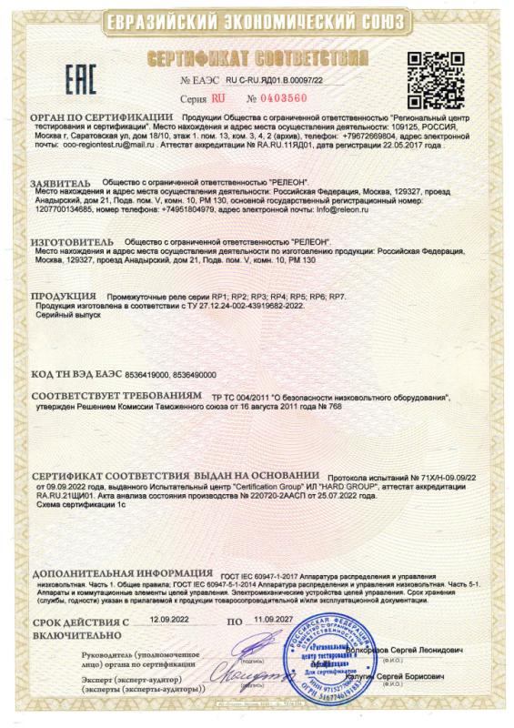 Сертификат соответствия ЕАЭС промежуточные реле серии RP Релеон