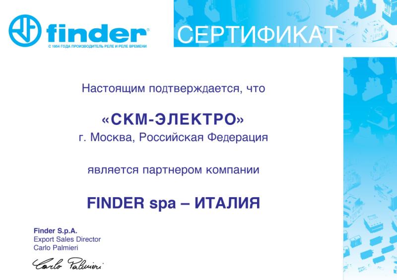 Сертификат подтверждения официального партнерства СКМ-ЭЛЕКТРО и FINDER spa - Италия