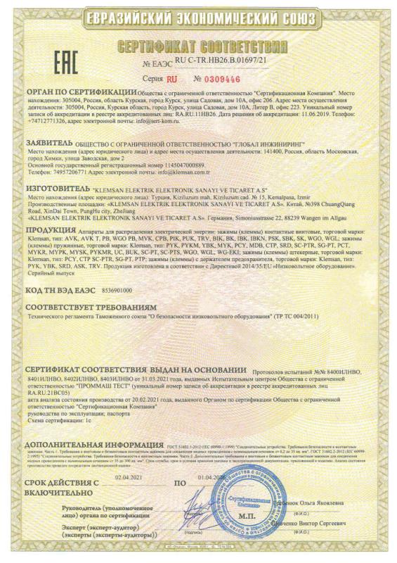 Сертификат соответствия ЕАЭС аппараты для распределения электрической энергии (клеммы) KLEMSAN