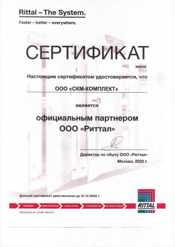 Сертификат подтверждения официального партнерства СКМ-ЭЛЕКТРО и ООО Риттал