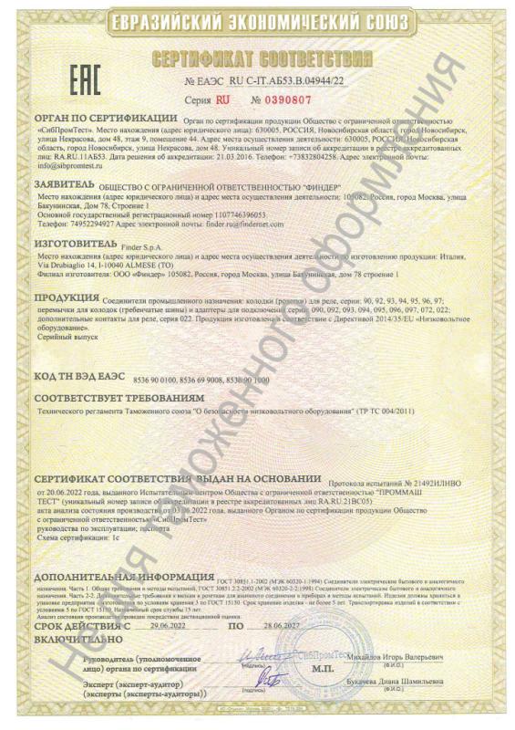 Сертификат соответствия ЕАЭС Устройства коммутационные защиты и управления Finder