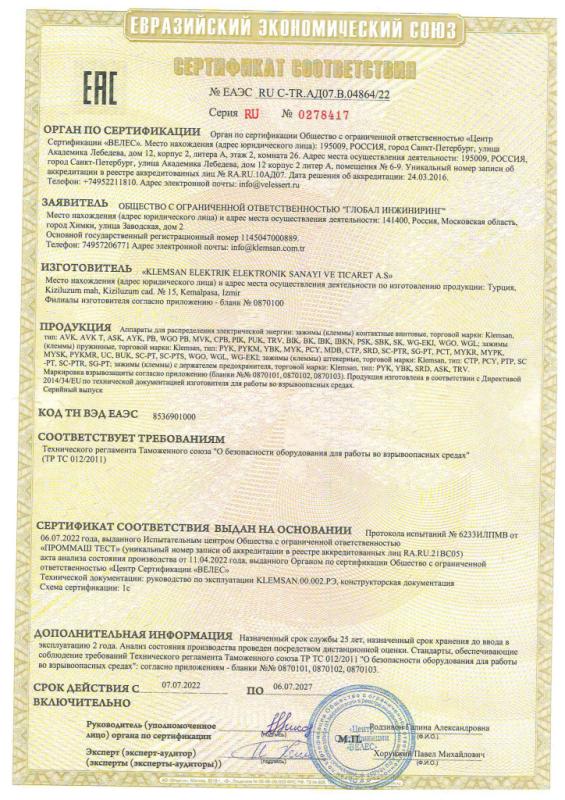 Сертификат соответствия ЕАЭС зажимы (клеммы) KLEMSAN